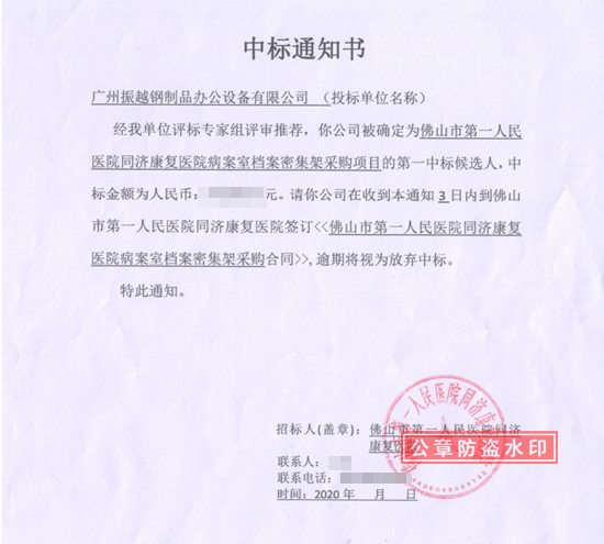 經過公司專業(yè)團隊制作標書,密封完整后遞交給了醫(yī)院招標部,再陸續(xù)經過醫(yī)院招標辦專家各方面綜合對比,最終得出由我公司廣州振越鋼制辦公設備有限公司中標。在中標后的2個工作日內,我公司安排了專業(yè)的人員勘察現場,經過現場實地測量勘察,現場尺寸符合醫(yī)院招標要求,可按照招標要求生產密集架尺寸。
