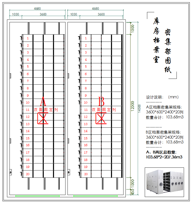 根據(jù)客戶前期提出的幾個要求,我司設(shè)計部與客戶溝通好過道后,大幅度利用空間,每個檔案室設(shè)計了四組一列*20列的數(shù)量,并中間設(shè)計一列固定列,為了降低客戶超荷移動,有效提高架體壽命。