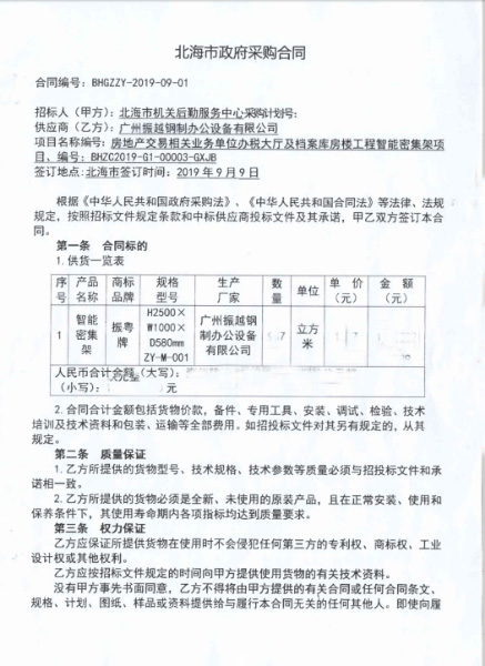 因此想采購一批智能密集架、想詢找廣西或廣東生產密集架的廠家, 并有智能電動密集架資質的公司2019年8月份進行公共投標,通過激烈的競標甄選,最終篩選了我們公司,廣州振越公司生產的智能檔案密集架。